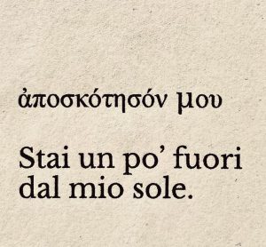 Engleski Stand a little less between me and the sun na talijanskom zvuči Stai un po’ fouri dal mio sole što bi u slobodnijem prijevodu značilo izađi iz mog sunca, a to bi bila preteča današnjoj Izađi mi iz aure.